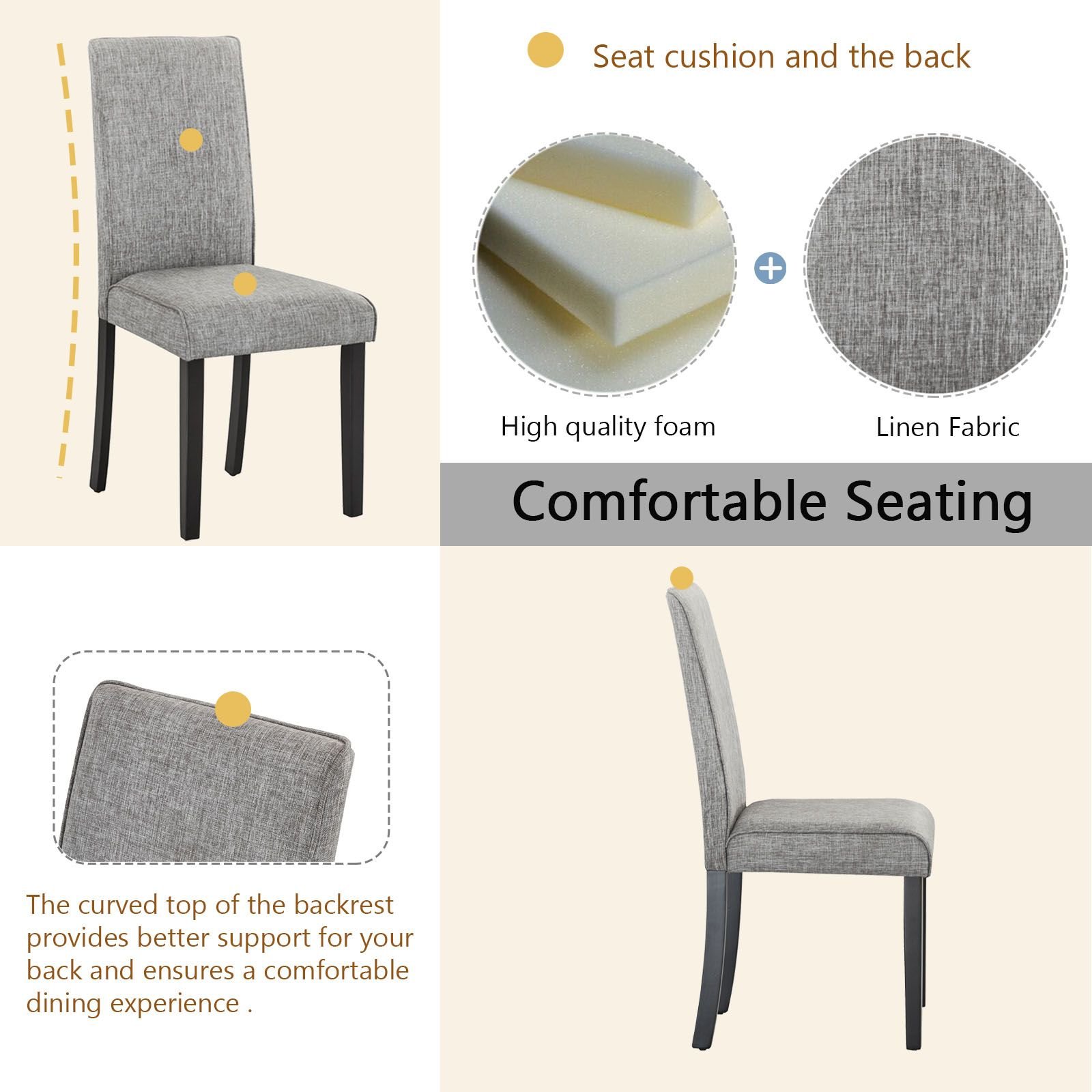 Comfortable Seating: The four upholstered chairs, cushions and backrests are filled with high-quality foam for optimum comfort. The curved top of the backrest provides better support for your back and ensures a comfortable dining experience. When not in use, the chairs can be stored under the dining table to optimise your living space.