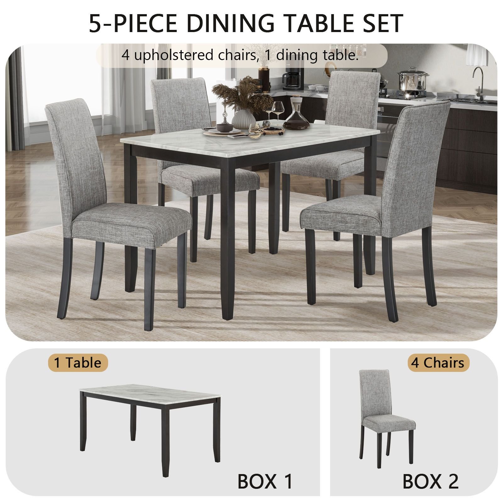 5 Pieces Dining Table Set: This dining table set includes a gorgeous rectangular faux marble table and four stylish upholstered dining chairs. It's perfect for families and guests alike! The faux marble dining table is not only a stunning visual treat but also a practical choice. The coated and finished table top is stain resistant and can be easily cleaned with a damp cloth. Effortlessly maintain a glossy and smooth finish to create an impeccable dining space.