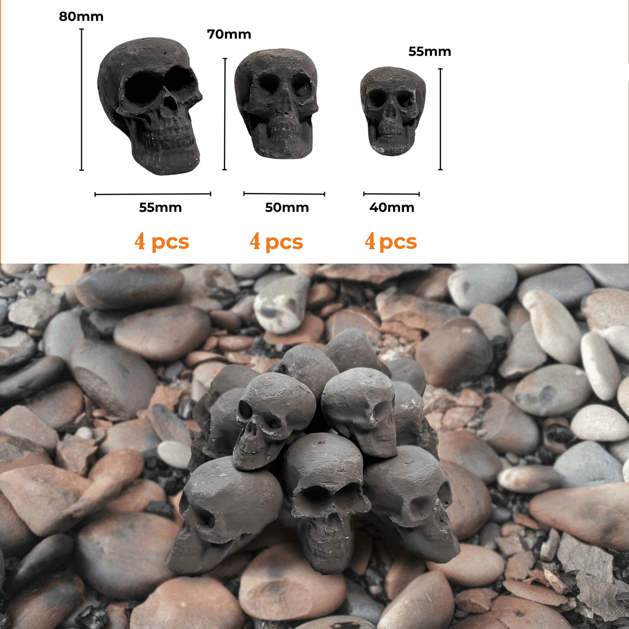 12pcs firepit skull logs set: 4pcs "5 x 4 x 4cm" skulls for fire pit, 4pcs "6.1 x 5 x 5.8cm" skull fire logs,4pcs "7 x 5 x 7cm" human skull fire pit.