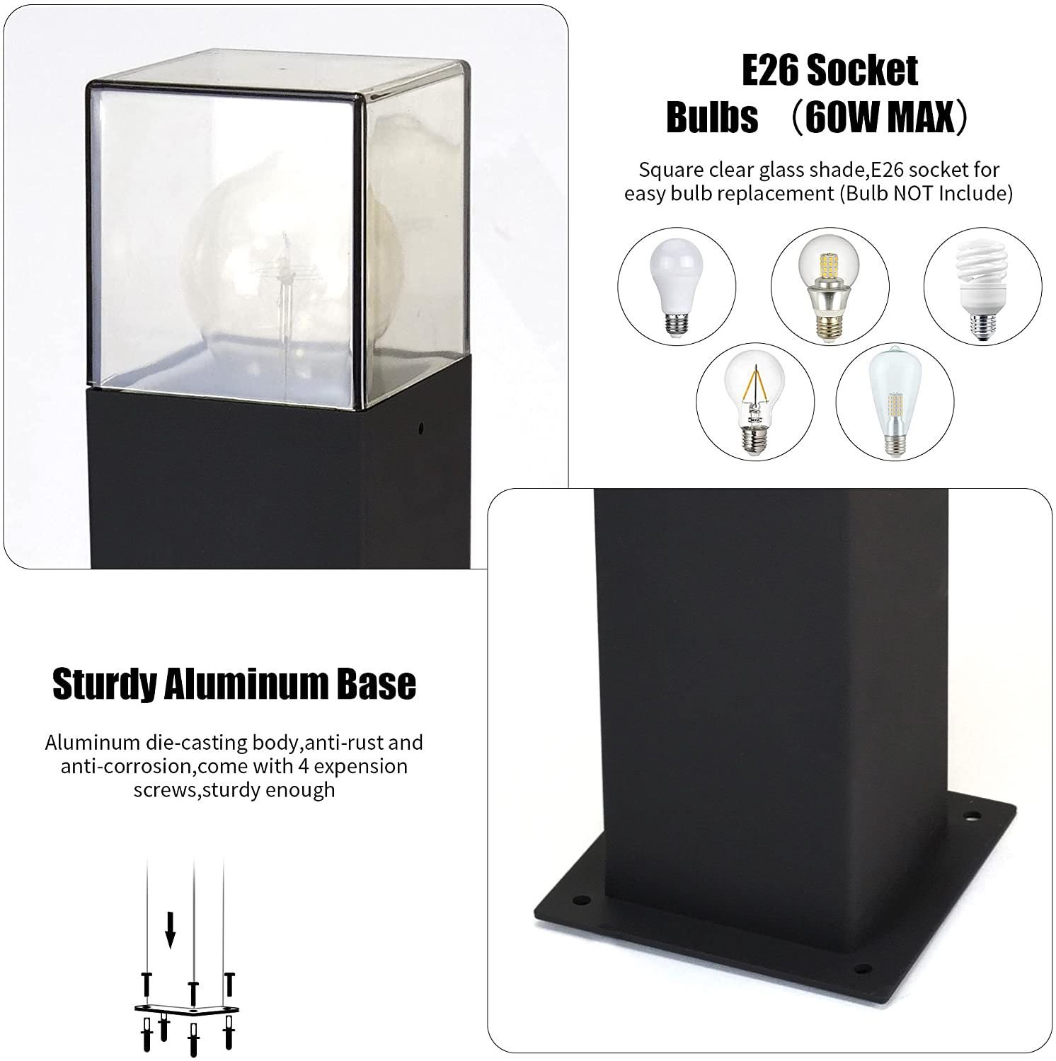 2.Driveway lights details: Hardwired, 2 heights 2 colors available, pathway lights size: 4.72*4.72*19.69/31.5in, Max.40W, E26 base (bulb not included)