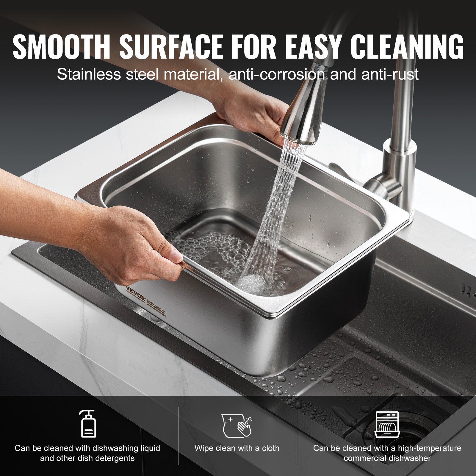 The hotel pan is made from high-quality, food-grade stainless steel, capable of withstanding high temperatures and freezing. They are suitable for ovens, steam table warmers, refrigerators, and freezers, perfect for storing and cooking food.