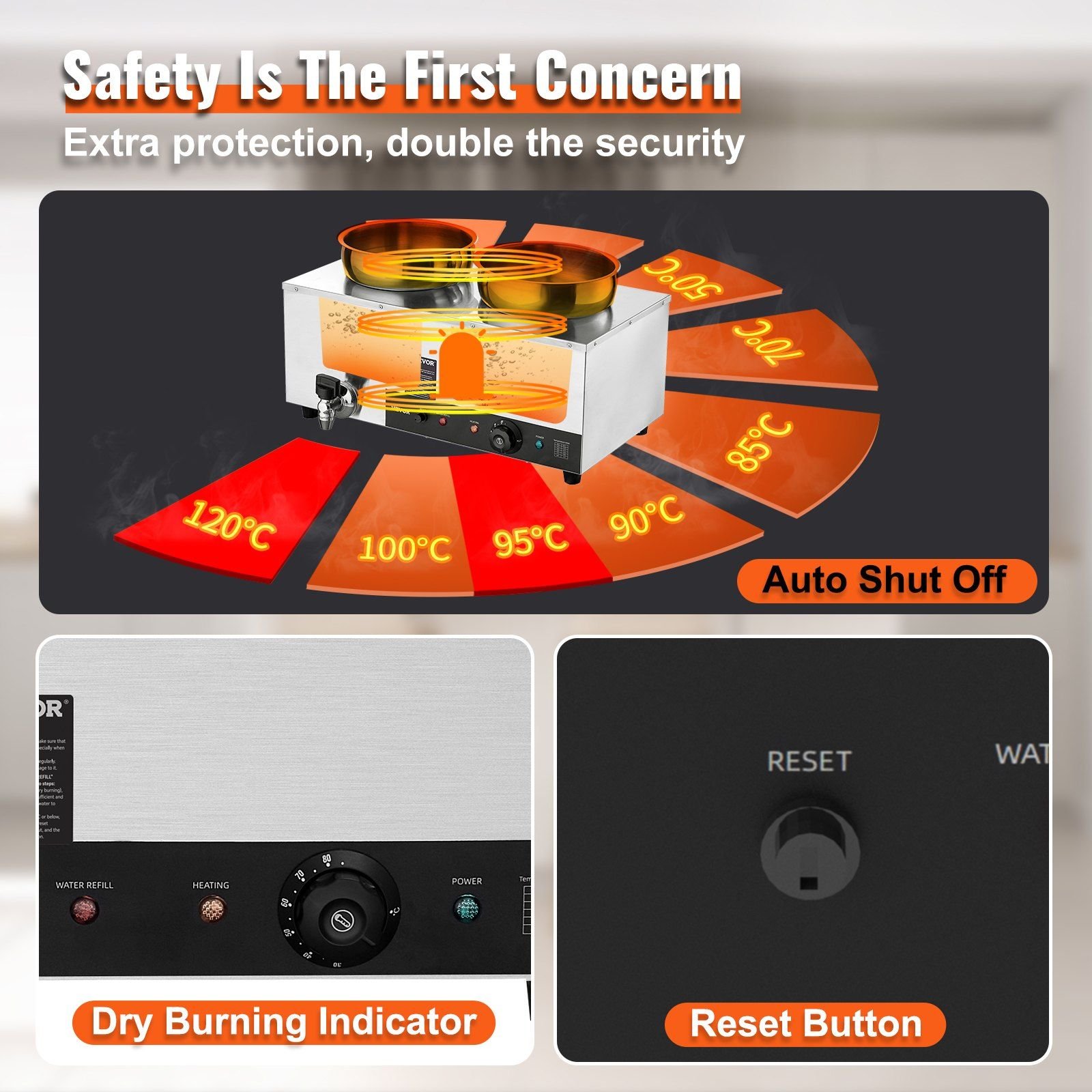 3.Additional Security: We have upgraded our food warmer with newly designed “Dry Burning Indicator” and “Reset Button”. The dry-burning indicator function automatically stops heating the food when the temperature exceeds 248°F (120°C). To resume operations, simply refill the water and press the Reset Button.