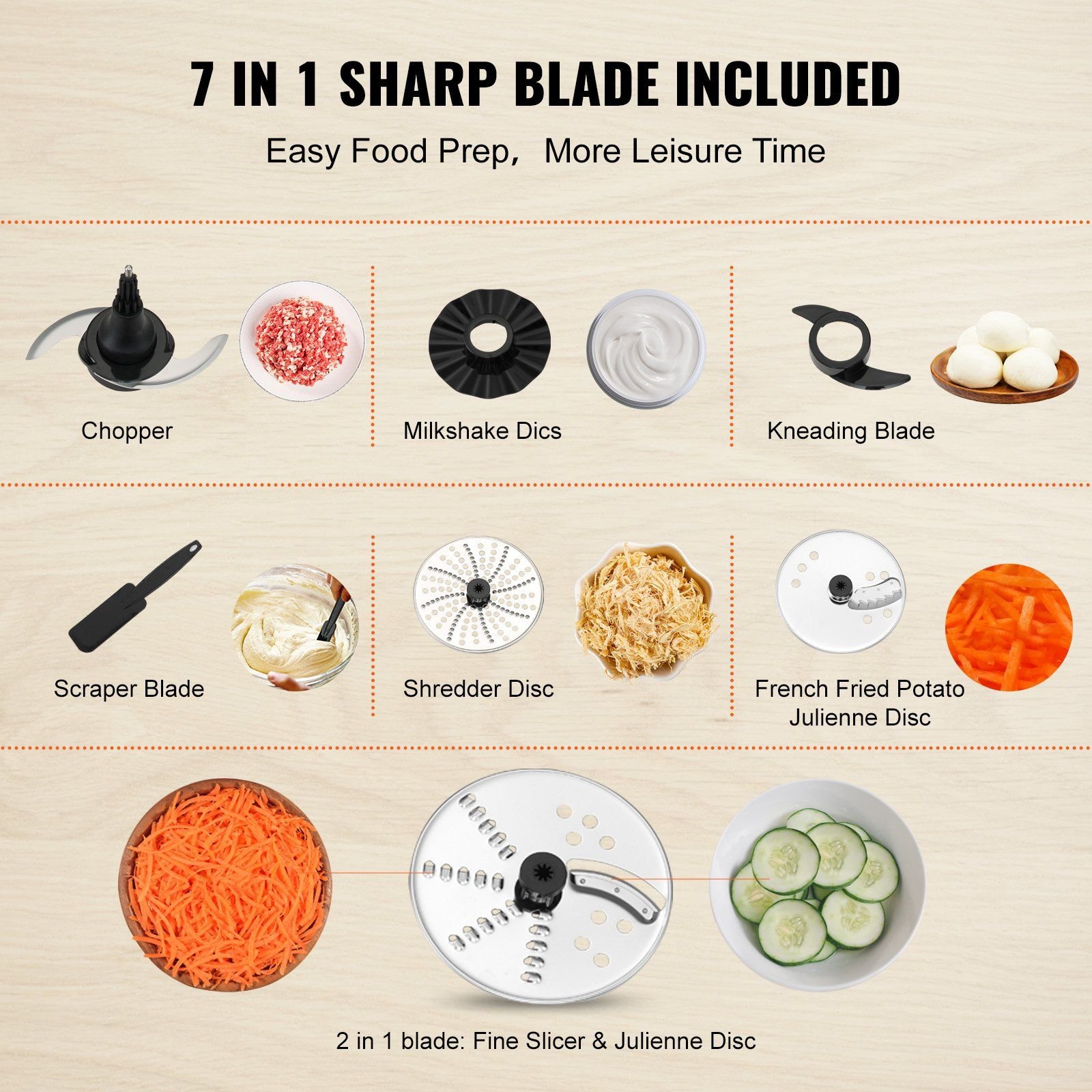 1.Multi-Functionality: The multifunctional food processor is equipped with 3 stainless steel discs, 1 stainless steel S-shaped meat grinding blade, and 1 S-shaped dough blade, along with a scraper. You can perform various tasks such as chopping, slicing, grinding, and kneading.