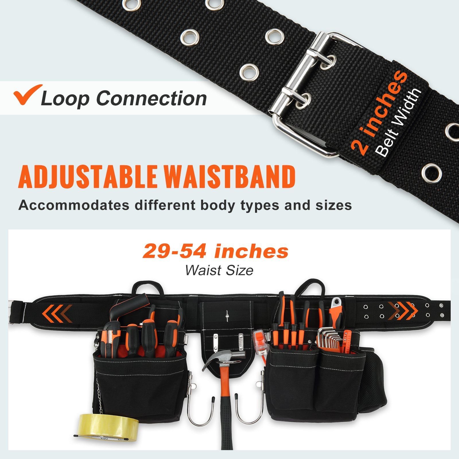 3.Flexibility is Key: Adjust to perfection! Feel the freedom with our adjustable waist strap. Whether you like it snug or a tad loose, this electrician tool belt's got your back. And don't worry about those tools taking a tumble; they'll stay put, safe and sound.